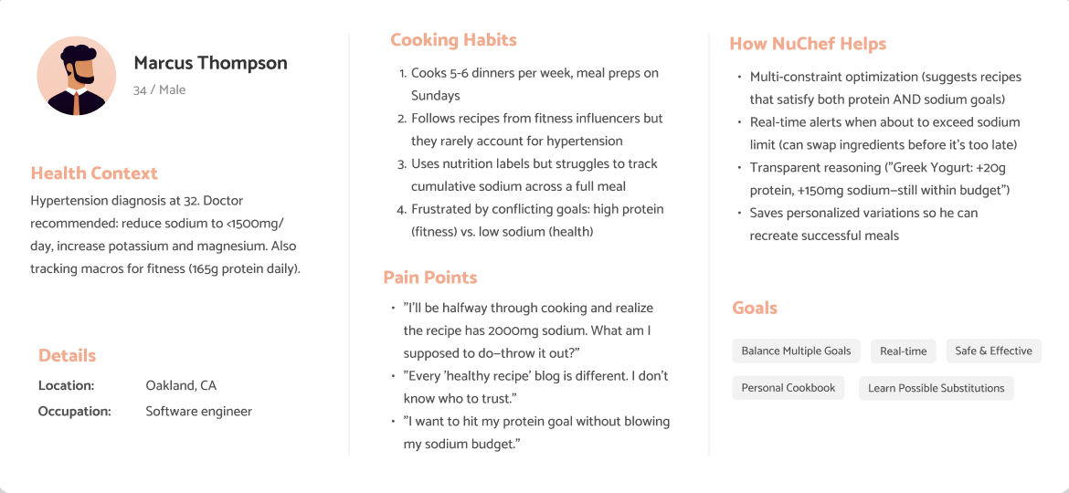 For many people managing diabetes, hypertension, or high cholesterol, cooking has transformed from a creative outlet into an anxiety-inducing math test. Existing tools require complex mental arithmetic (tracking cumulative sodium across all ingredients), provide feedback only after it's too late to adjust (post-meal nutrition summaries), and offer vague health advice ("reduce sugar") without concrete substitutions. These interfaces feature scattered information, unclear guidance on what's safe, and punitive framing of mistakes, making it difficult for users to cook independently and confidently. As a result, many individuals experience decision fatigue, high error rates, and cooking anxiety, frequently abandoning creative cooking in favor of restrictive meal plans or relying on family members for help.